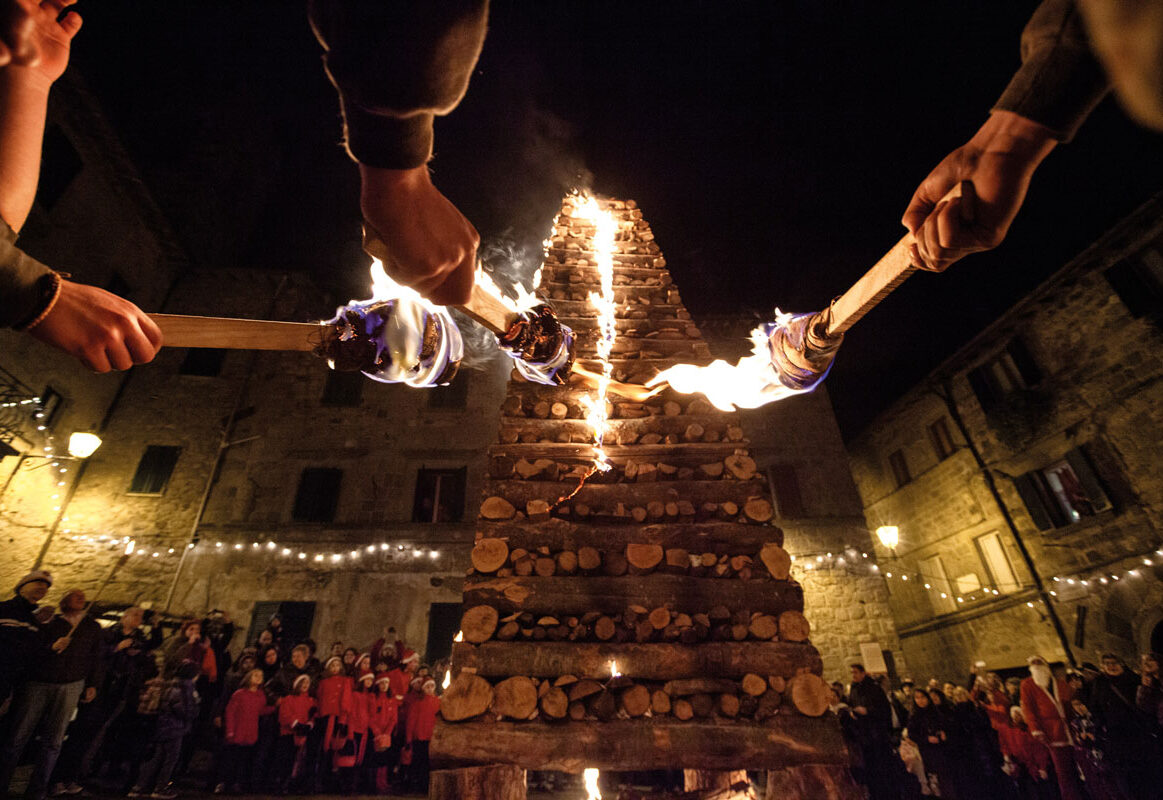 Ogni 24 dicembre Abbadia San Salvatore, sul Monte Amiata, torna a vivere la sua festa più bella. Sacra al punto da perdersi nella memoria, tanto antica da smarrirsi nella notte dei tempi, la sera delle Fiaccole (pire di legna alte fino a sette metri) non è solo un momento sospeso nel sogno in attesa del Natale, non solo il rinnovarsi di ancestrali liturgie tramandate di padre in figlio, di nonno in nipote, ma l’apice perfetto di un tempo incomparabile che è radicato nel cuore e nel DNA di ogni abitante di Abbadia.